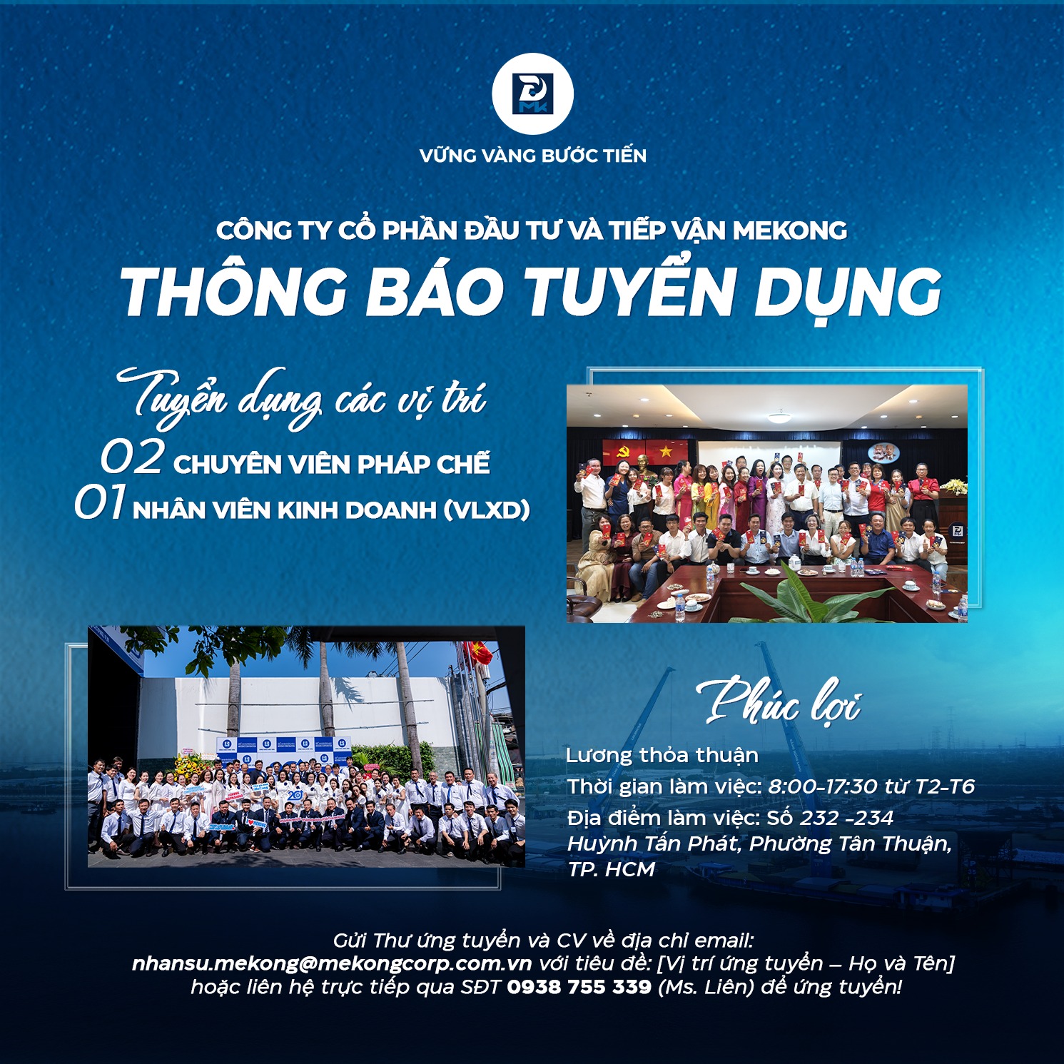 Mekong Corp rất mong chờ thư ứng tuyển của các bạn và mong rằng chúng ta sớm có cơ hội cùng nhau viết tiếp câu chuyện vươn tầm phía trước.